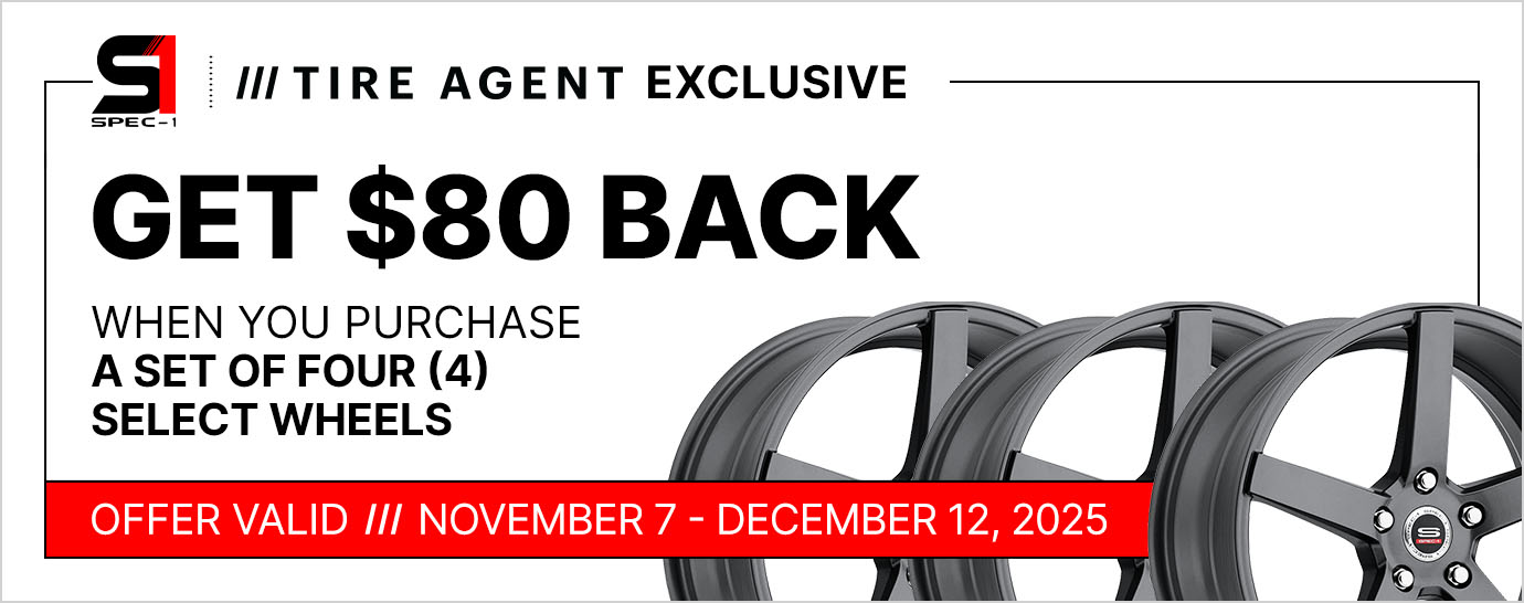 Offer valid for residents of the United States (excluding Hawaii and Alaska) only. Purchase must be completed between 11/07/2025 and 12/12/2025. Limit of one (1) redemption request $80 Reward per purchase of four (4) select Spec-1 wheels.
